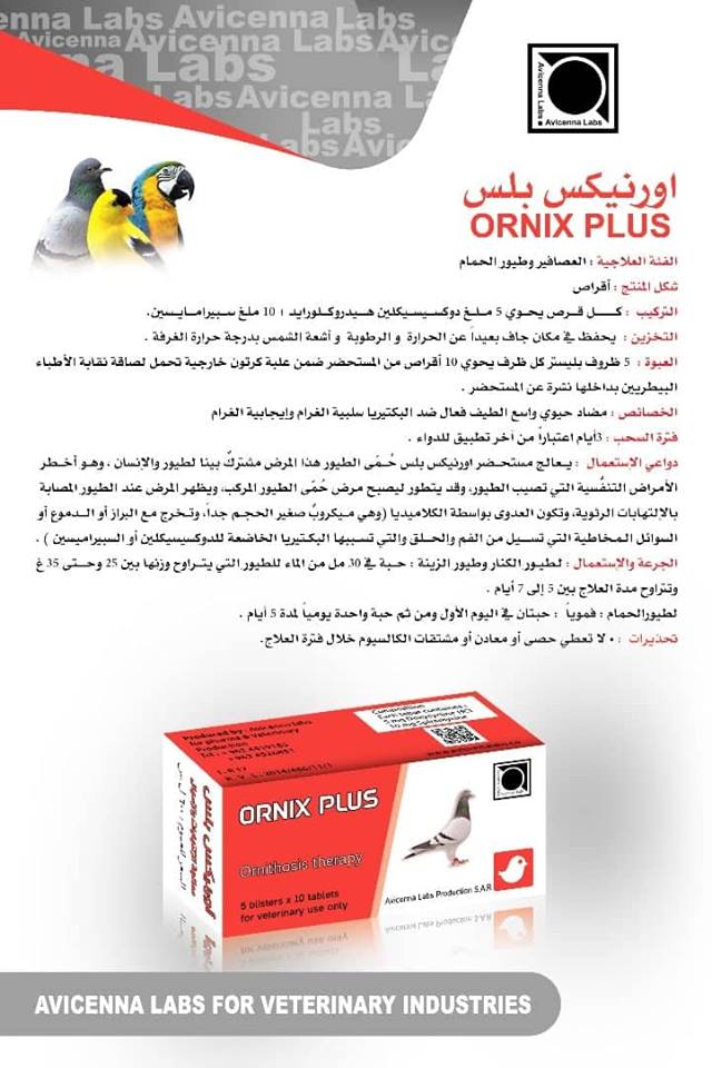 مضاد حيوي واسع الطيف فعال ضد البكتيريا سلبية الغرام وإيجابية الغرام, , يعالج مستحضر اورنيكس بلس حُمَّى الطيور هذا المرض مشتركٌ بينا لطيور والإنسان، وهو أخطر الأمراض التنفُّسية التي تصيب الطيور، وقد يتطور ليصبح مرض حُمَّى الطيور المركب، ويظهر المرض عند الطيور المصابة بالإلتهابات الرئوية، وتكون العدوى بواسطة الكلاميديا (وهي ميكروبٌ صغير الحجم جداً، وتخرج مع البراز أو الدموع أو السوائل المخاطية التي تسيل من الفم والحلق والتي تسببها البكتيريا ,ومرض الايكولاي الخاضعة للدوكسيسيكلين أو السبيراميسين ) .