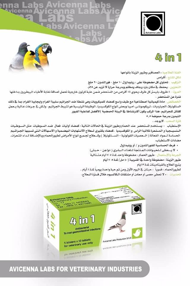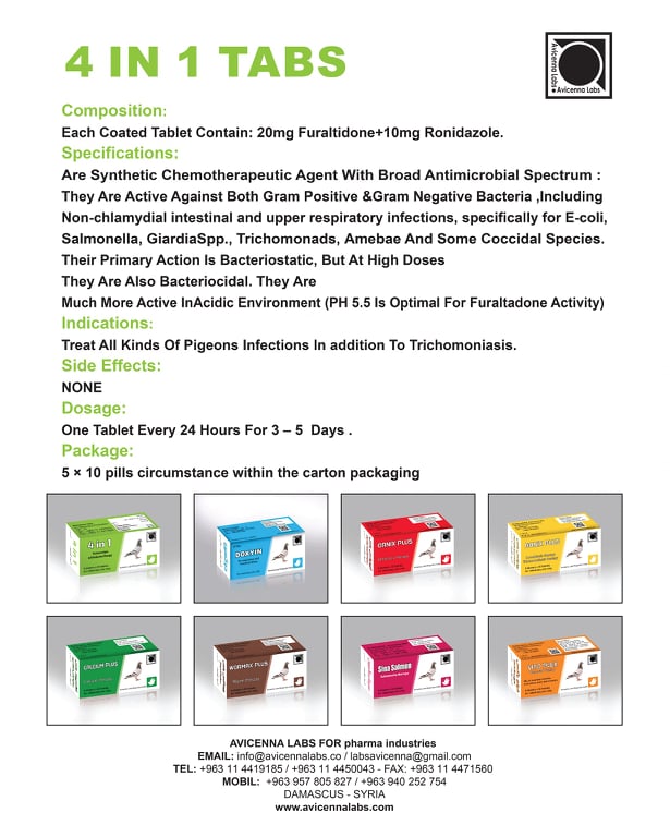 ü4’ 1 arada preparatı, çeşitli enfeksiyonların tedavisinde kullanılır (E. coli, koksidiyoz, salmonelloz ve trikomoniyaz). Geniş antimikrobiyal spektruma sahip sentetik bir kimyasal bileşiktir; hem Gram-negatif hem de Gram-pozitif bakterilere karşı aktiftir, Salmonella, Giardia, Trichomonas, Amip ve bazı Coccidia türleri dahil.